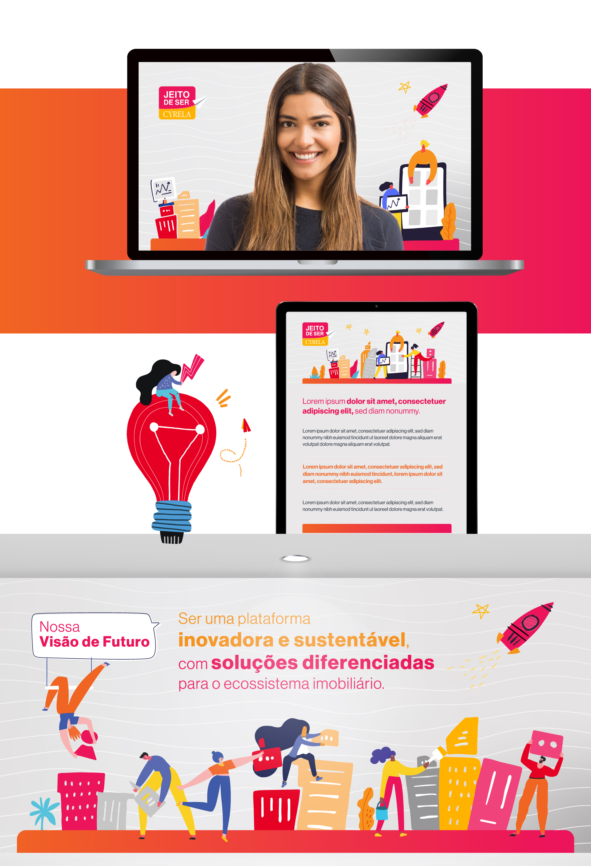 Criação de key visual e todas as peças para dar apoio a implantação e comunicação da nova cultura da Cyrela aos seus colaboradores. Entre as peças que fizemos estão os icones com os pilares que foram aplicados em canecas, adesivos e também na sinalização nos escritórios.